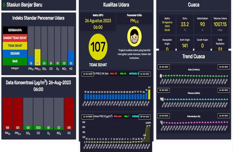 Kondisi terkini sabtu 26/08/23 kabut asap menutupi sebagian wilayah Kota Banjarbaru dengan kondisi warna kuning (tidak sehat) kepada seluruh masyarakat Kota Banjarbaru harap menggunakan masker …